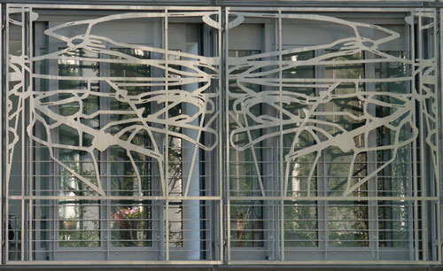 este edificio cuya fachada lleva una reja moderna muy curiosa.