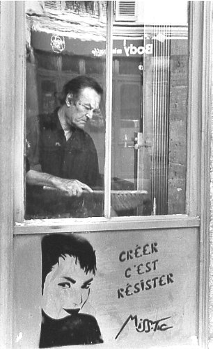 El hombre estaba trabajando en su taller. La Doña traviesa le recordaba la divisa : "Crear es resistir"