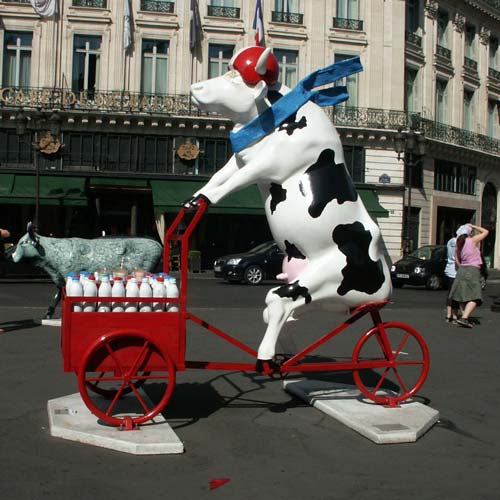 Esta vaca fue diseñada por Martine Diotalevi y patrocinada por la Asociación Interprofesional Lechera. Instalada en la plaza de la Ópera, consiguió el gran premio del público. Ahora alegra el patio de su patrocinador.