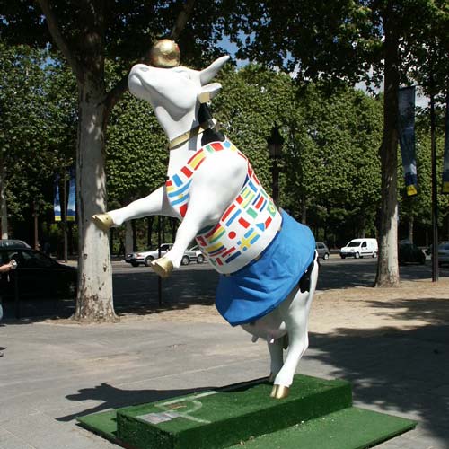 Diseñada por René Page, esta vaca fue patrocinada por la Asociación Interprofesional Lechera. Instalada en los Campos Eliseos, evocaba con una gracia relativa, la gran fiesta que es la Copa del Mundo de fútbol.